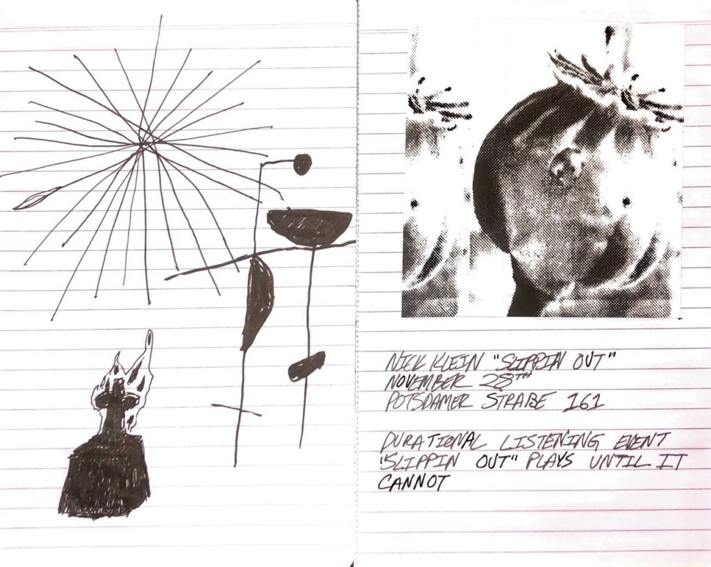 Nick Klein (1987, West Palm Beach, Florida) is an artist from the United States who works in sound, sculpture, and publishing editions. Klein likes loud volume and fine dining.
